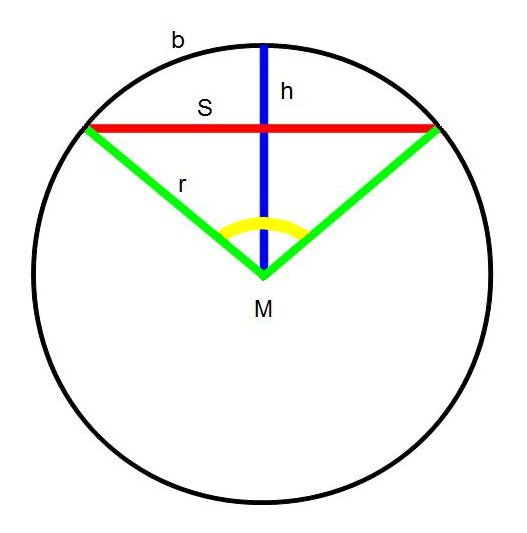 S: Sehne, rot h: Höhe des Kreisabschnitts b: Bogenlänge des Kreisabschnitts r: Radius des Kreises M: Mittelpunkt des Kreises γ: Winkel des Kreissegments, gelb | ||
