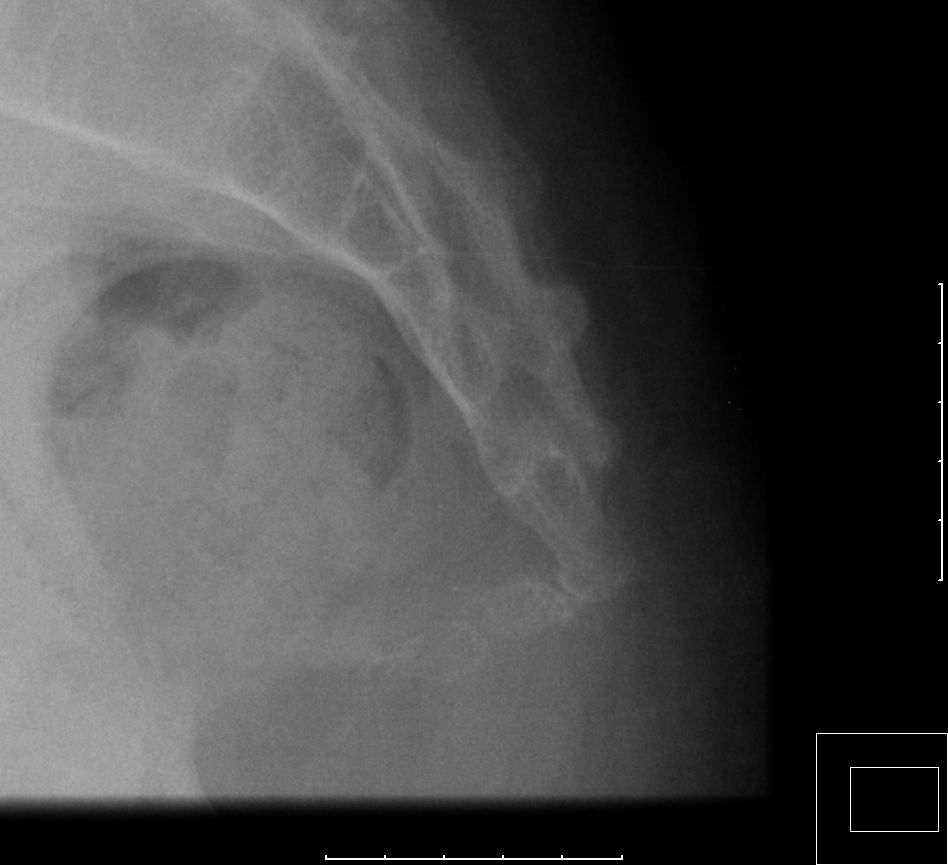 | Schambein | 95-jährige demente Frau mit einem plutenden Endometriumkarzinom. Im Planungs-CT eine alte doppelseitige Schambeinfraktur. Urache wegen Demenz nicht zu ermitteln.![]() |
