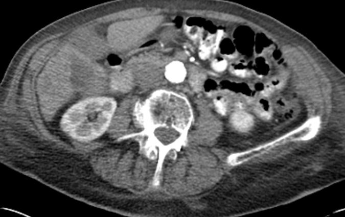 89-jährige Frau mit Infektzeichen. Zunächst sonographisch Verdacht auf Gallenblasenempyem. Im CT ein Gallenblasenkarzinom mit Leberinfiltration. Wegen Alter und AZ palliative Versorgung. | ||