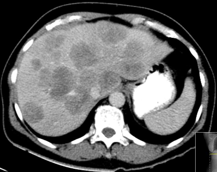 | CT | 61-jährige Frau mit Metastasenleber. Als Primärtumor wurde
