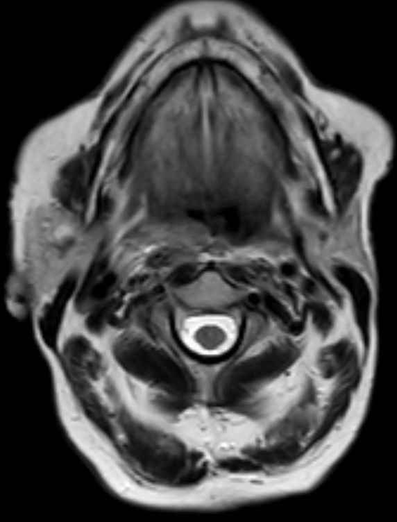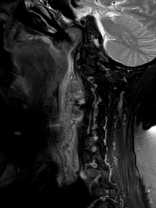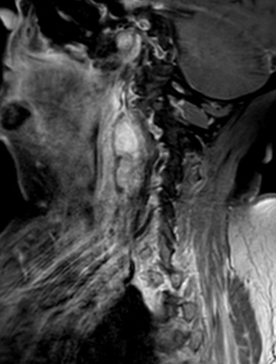 Dysphagie. Es besteht eine Raumforderung rechts retropharyngeal. Mukosa intakt.![]()  |